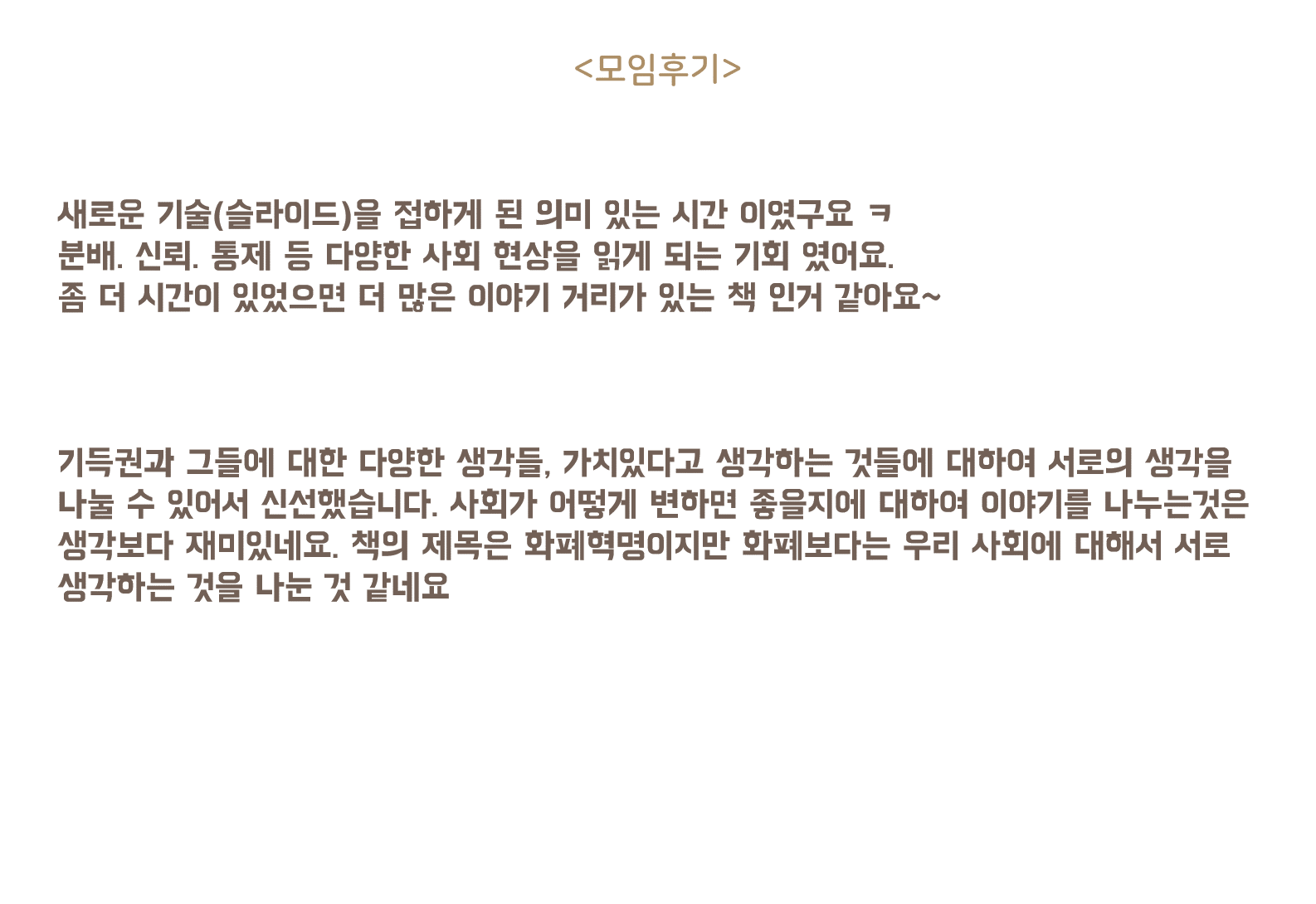 그리고 부의 재분배가 가능할까라는 질문을 함께 공유했는데요. 과연 현재 부자인 사람들이 그대로 있을지, 돈을 버는 과정이 과연 정당했을까? 우리는 근본적인 부분부터 봐야하지 않나라는 생각을 하게 되었답니다.