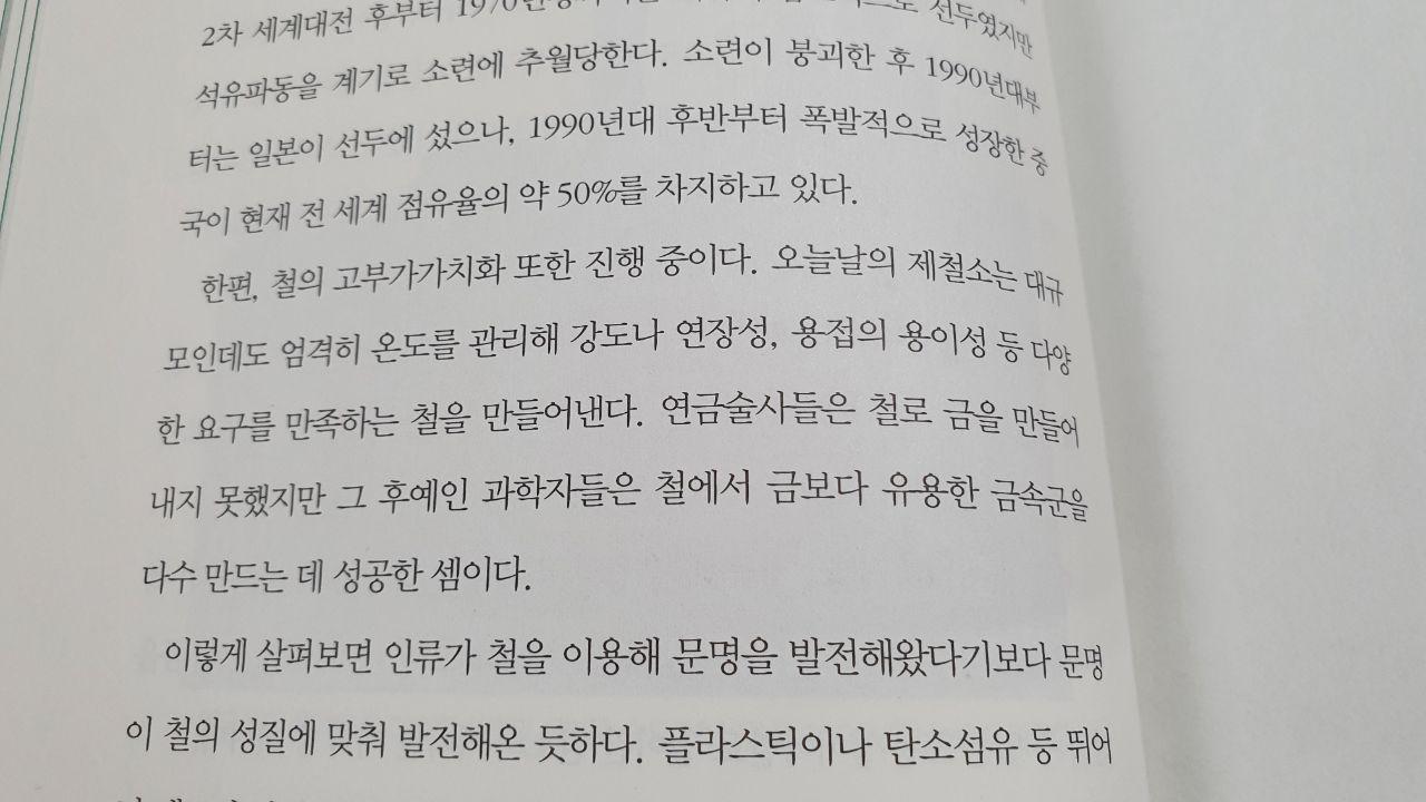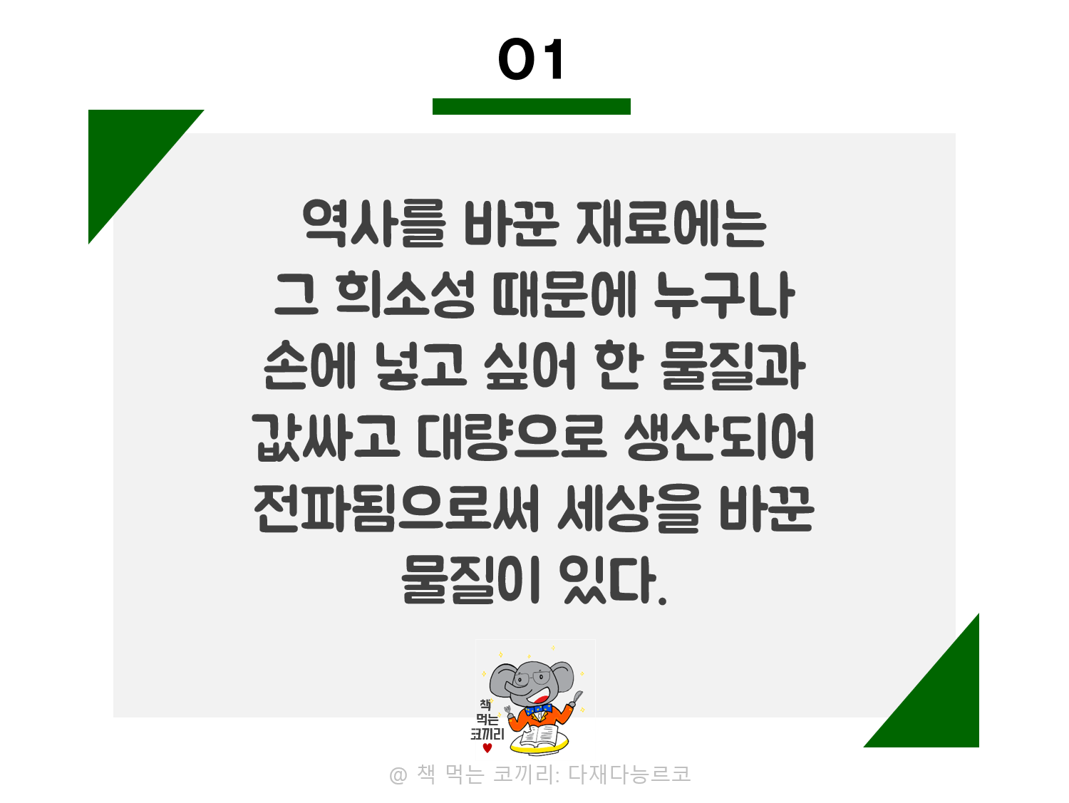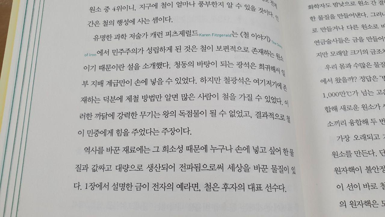처음 신소재라는 단어를 보고 내가 전혀 모르는 내용들이 나오면 어쩌나 싶었는데, 우리에게 굉장히 일상적인 금, 도자기, 콜라겐 등 다양한 재료들이 어떻게 우리의 삶을 바꿨는지에 대해서 흥미롭게 다루고 있다. 세계 속에서 삶의 변화를 일으킨 재료에 대한 전반적 이해를 도울 수 있는 설명과 역사적 이야기를 함께 다루고 있어서 쉽게 읽을 수 있다. 예를 들어 금에 대하여 어떻게 금이 생겨났는지 신화 속 이야기나 그곳에 얽힌 실제 역사, 그리고 모두가 갈망하는 금이지만 금 자체는 어떤 일에 딱히 도움이 안된다는 사실까지 다룬다. 어쩌면 우리는 우리의 삶에 존재하는 많은 것들에 대해서 쉽게만 생각하고 있지 않았을까라는 생각했다. 신소재는 아닐지 모르겠지만 내 주변에 흔하게 있는 물건들도 결국 이 책에서 다루는 재료들처럼 여러 역사와 이야기가 담겨있지 않을까라는 생각을 -