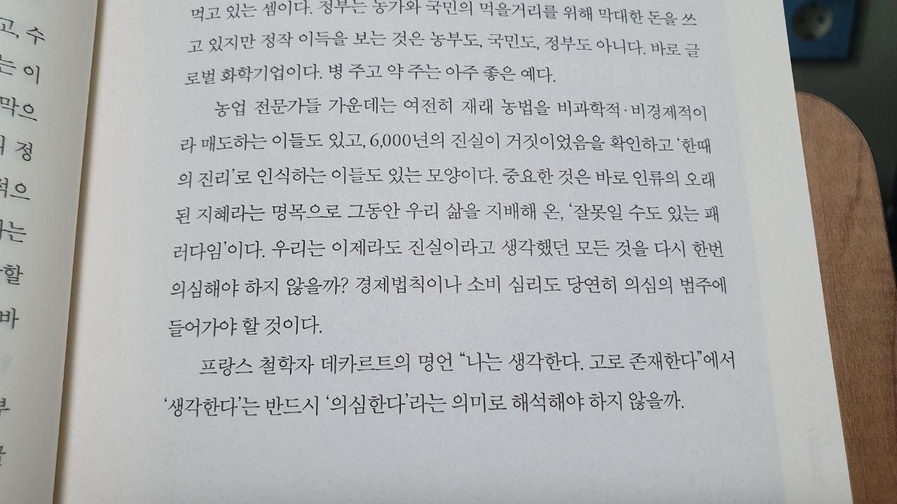 책은 쉽게 읽힌다. 경제라면 따분할 수도 있다고 생각할 수 있는데 읽다보면 사례들도 생활밀착형이고 상당히 흥미로운 주제를 다루고 있어서 참 좋다. 읽다보면 당연하다고 생각했던 문제들이 어?라면서 반문이 든다. 정말 자본주의라는 프레임안에서 어떤 일들이 이루어져있고, 우리가 각 개인만을 생각하고 눈이 가려진 채 얼마나 많은 거짓말이나 현혹을 당해왔는지를 떠올리게 된다. 대부분의 일들이 단순히 따로따로 보면 문제가 어떤 문제인지 볼 수 없었던 것들을 연결지어 만나보니 다르고 생각이 더 넓어지는 경험을 해볼 수 있다. 인류의 오래된 지혜라는 명목으로 그동안 우리 삶을 지배해 온 "잘못일 수도 있는 패러다임"에 대하여 지금껏 진실이라고 생각해왔지만 한번쯤 모든 것을 의심해볼 필요가 있음을 바라보게 한다.