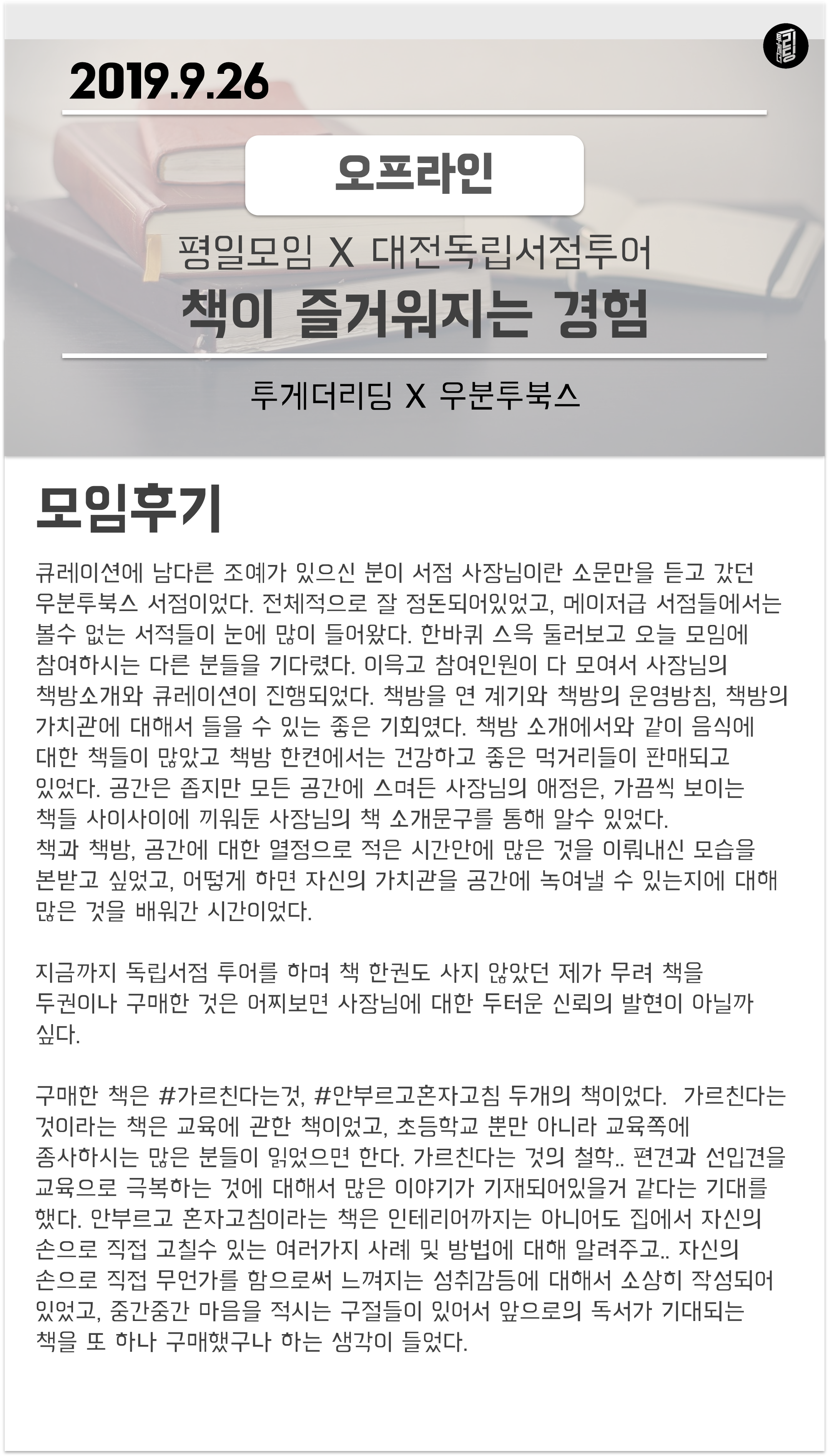| 투게더리딩 X 대전 독립서점 투어│대동 구름책방 (2) | 2019.10.15 |