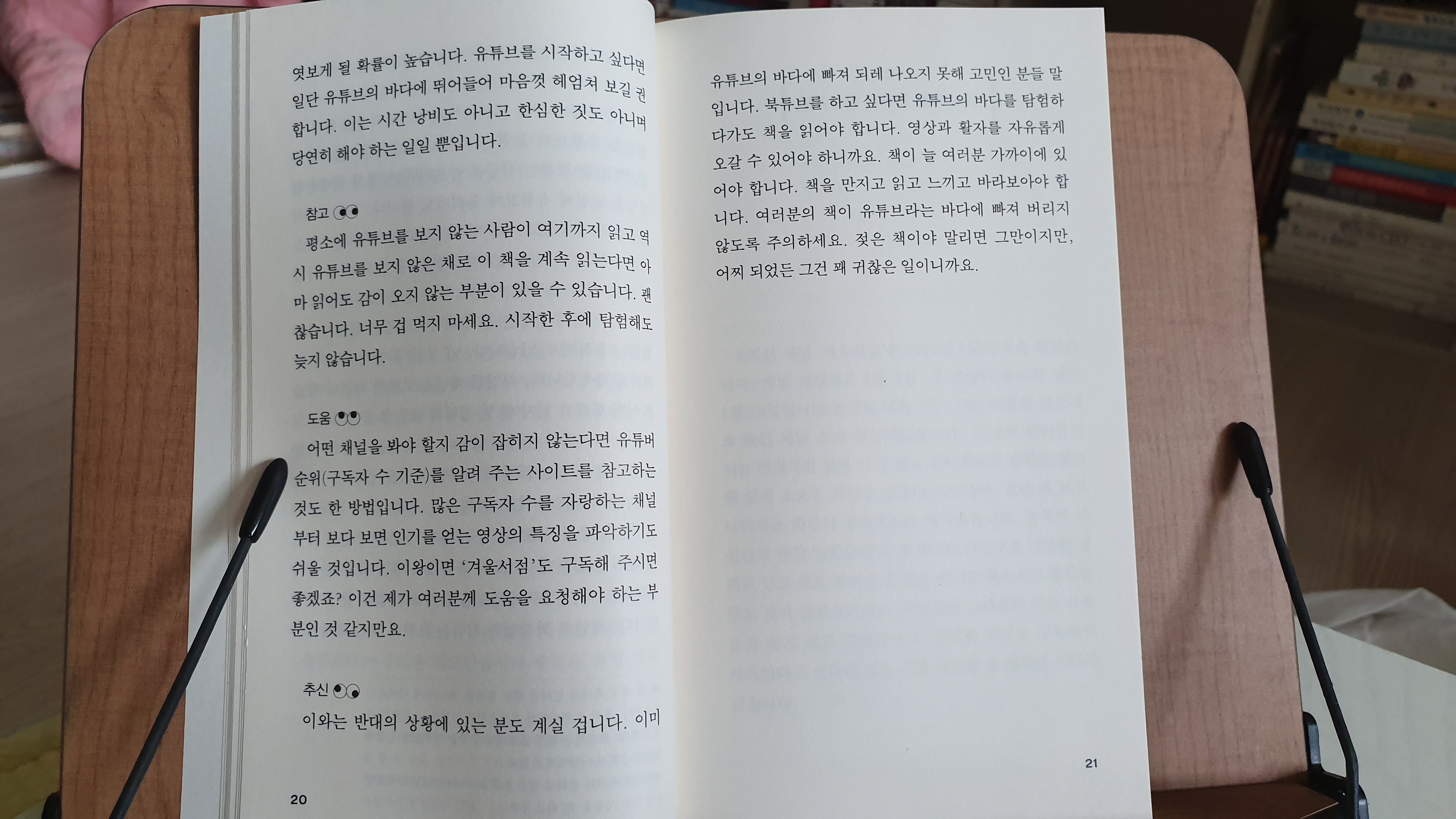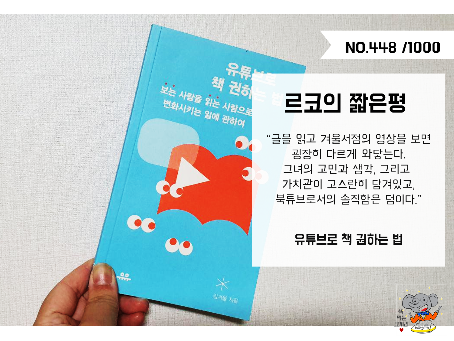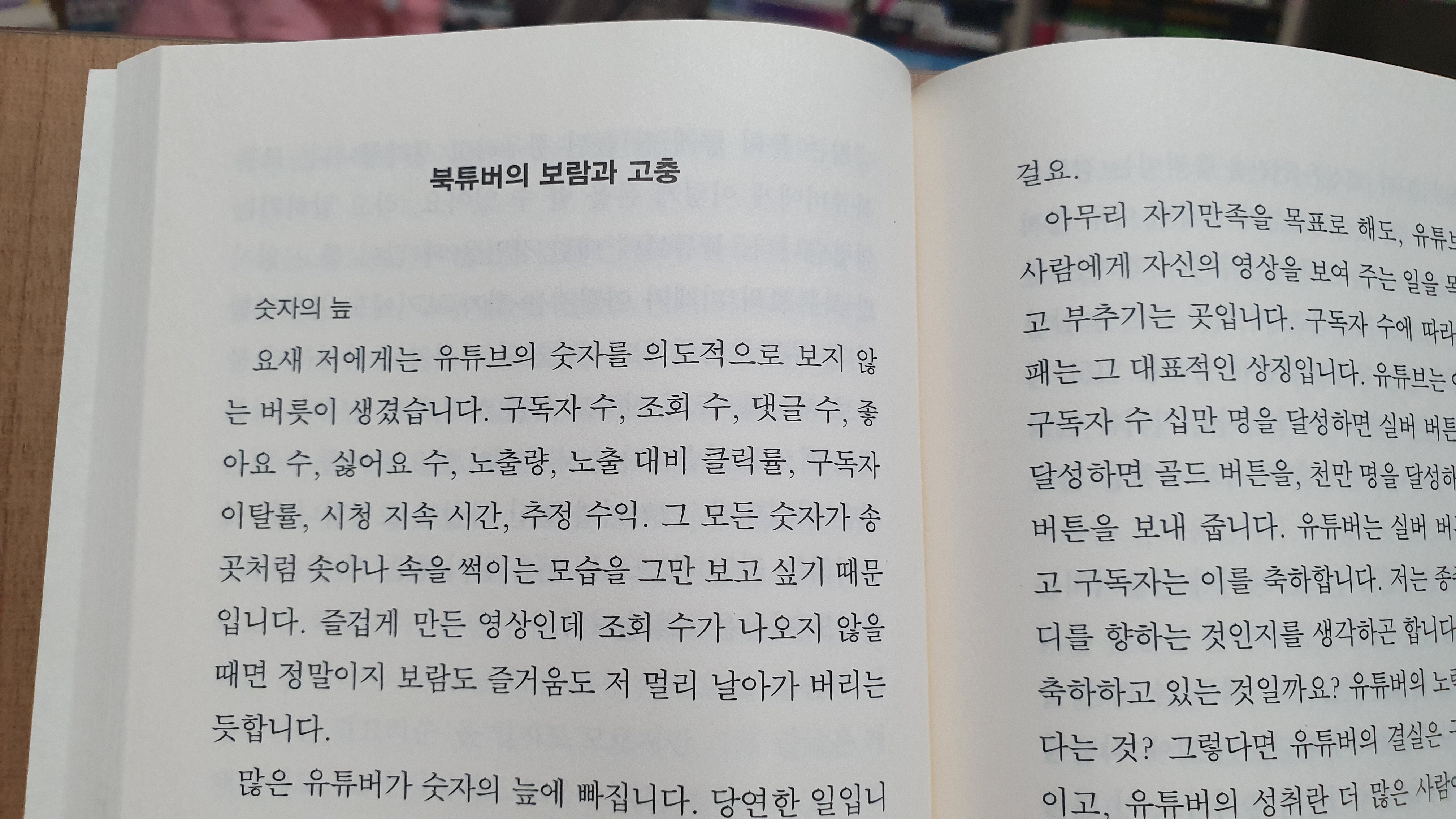 '책'을 매개로 꾸준함을 발휘하려면 분명 책을 좋아해야하고 읽어야한다. 어쩌면 그 시작부터가 참 쉽지 않은 일을 선택하는 지도 모른다. 기획부터 촬영, 편집에 이르기까지 무에서 유를 만들어내는 시도란 분명 쉽지는 않을 것이다. 나 역시 유튜브를 시도해보는 중이였기에 이 책의 내용들이 하나하나 공감이 갔다. 구독자를 100명 만드는 것조차 쉽지 않은 일이라는 것을 알게 된다. 또한 내가 보여주고 싶은 것과 사람들이 보고 싶어하는 내용이 일치하기란 쉽지 않기에 더욱 고민되는 부분이기도 했다. 이 책을 읽으면서 '유튜버'라는 직업을 조금 더 이해할 수 있었고, 그 과정이 쉽지만은 않은 길임을 느낄 수도 있었다.
