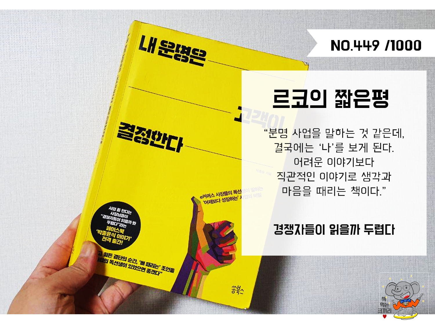 창업, 마케팅, 상품, 고객, 접객 등 사업을 하는 사람이라면, 고객을 만나는 사람이라면 생각해봐야할만한 내용들을 다루고 있어서 실질적으로 나와 비교해보면서 생각하게 된다. '어려운 게 아니고 안하는 겁니다'라는 뼈때리는 문장들이 끊임없이 나온다. 쓰는 단어가 인생을 만든다면서 스스로 못했다, 어렵다라는 말을 안했다라고 솔직하게 인정하면서 시작해야한다면서 자아성찰하게한다. 내 운명을 고객이 결정한다는 제목의 참 의미를 제대로 이해하려면 읽는 것 뿐 아니라 진짜 실천으로 맞이해야한다고 느껴질 정도이다. 내가 멈추고 실천에 옮기거나 깊게 생각해야하는 부분들이 많아서 책을 몇번이나 그냥 덮어야했다.