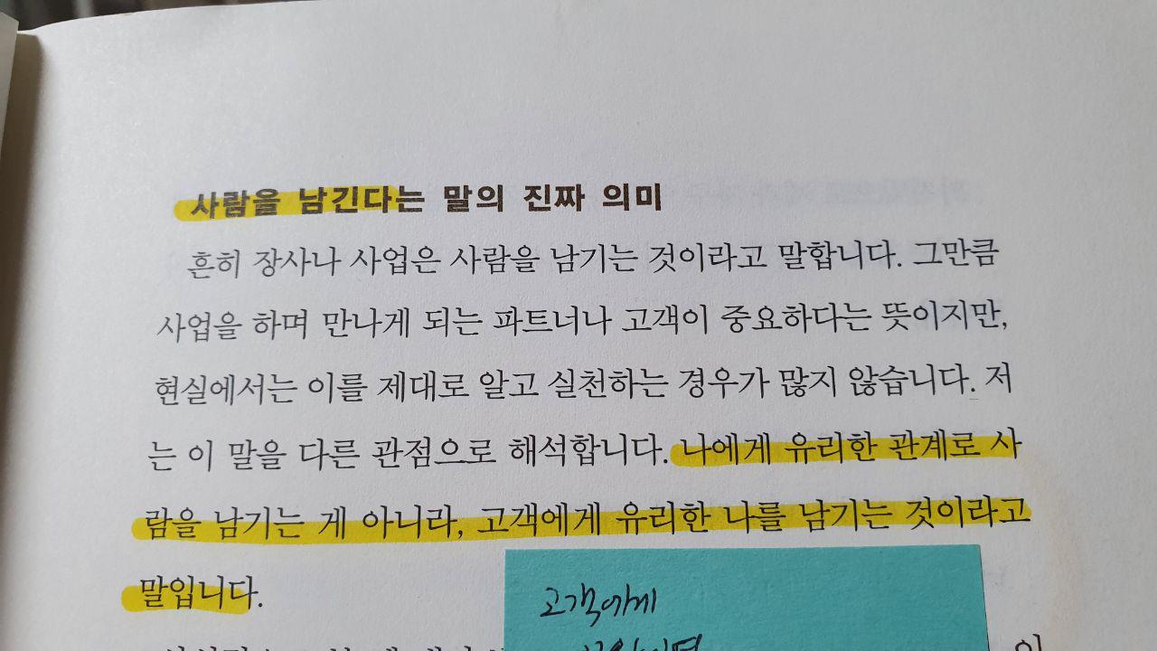사람을 남긴다는 말의 진짜 의미를 이 책에서는 "나에게 유리한 관계로 사람을 남기는 게 아니라, 고객에게 유리한 나를 남기는 것"이다라고 시작하는 정의부터 꽤나 생각을 하게 했다. 왠만한 책은 책 자체에 줄을 긋지 않는 내가 이 책은 안되겠다 생각해서 책과 형광펜, 포스트잇, 볼펜을 들고다니면서 읽고 내 생각을 바로잡아갔다. 처음에는 영업에 대해서 조금 생각해볼 수 있지 않을까하는 가벼운 생각에서 든 책은 한 챕터, 한 챕터마다 그동안 나의 '업'에 대해서 더 깊고 진하게 성찰해볼 수 있는 시간을 가지게 되었다.