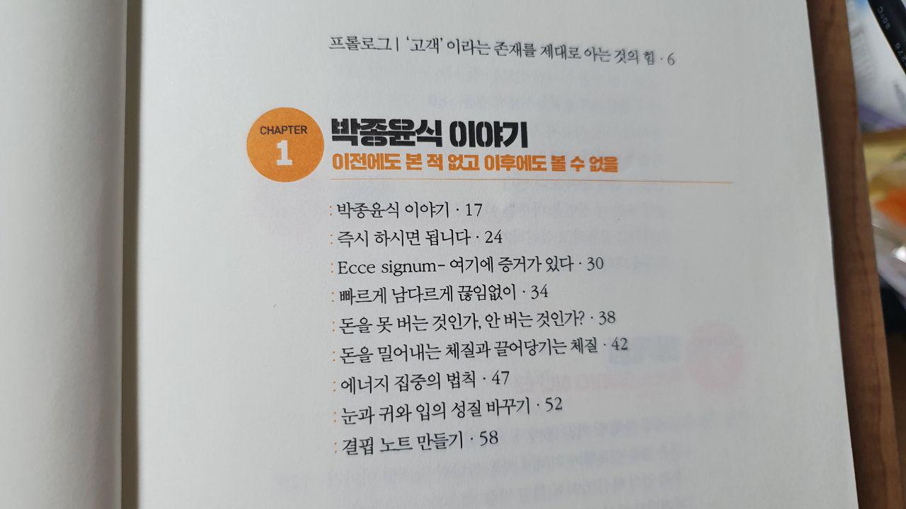 보통 책을 보면 프롤로그나 목차, 아니면 흥미로운 내용이 있으면 끌린다. 하지만 이 책은 프롤로그를 피기 전 '여기에 증거가 있다'라는 문장에 확 끌리게 되었다. 영업을 하고 있기에 '고객'이라는 단어와 뗄레야 뗄 수 없는 삶이기에 프롤로그부터 더 와닿았는지도 모른다. 내 운명은 고객이 결정한다 제목만 보면 어쩌면 철저히 '을'이여야하는 가라는 생각을 할지도 모른다. 하지만 읽어보면 분명 다르다는 것을 느낄 수 있을 것이다. '고객'에 대하여 정의 제대로 다시 해주며 어떤 위치에서 어떤 일을 하며 살아가는 사람들이든 자신의 현재를 제대로 바라보고 미래를 생각하게 하는 책이다.