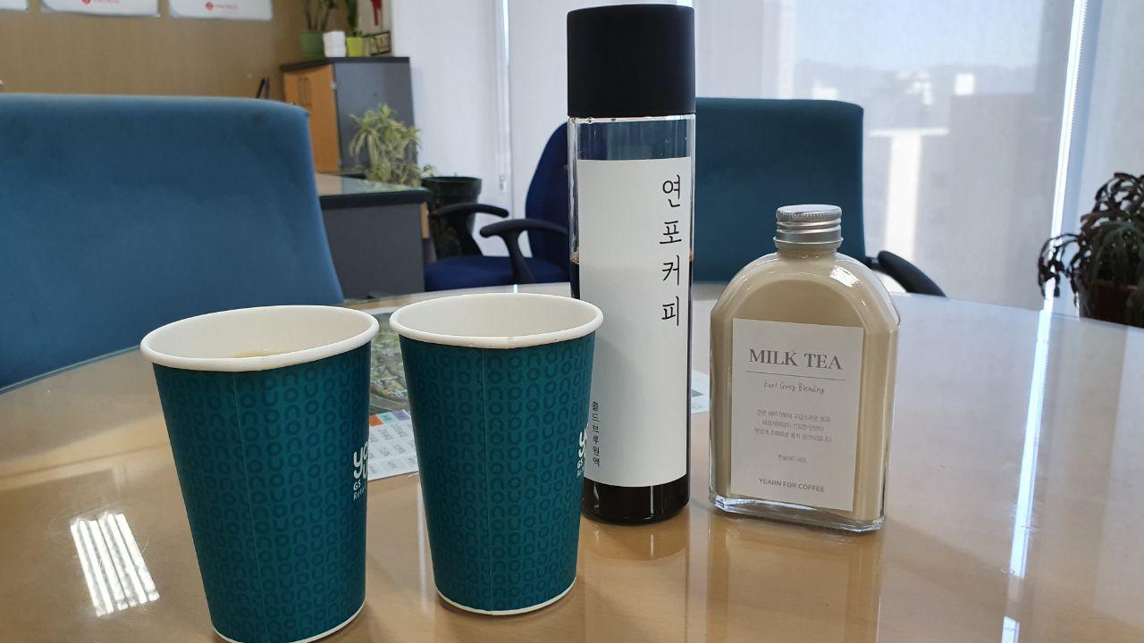 포장하기전에 미리 이렇게 받아서 사진을 찍어봤어요. 두개 다 직접먹기도 좋지만 선물용으로도 정말 좋겠다고 생각을 했어요. 커피도 깔끔한 케이스, 밀크티는 유리병케이스더라구요. 그래서 더 느낌이 좋아보였답니다.