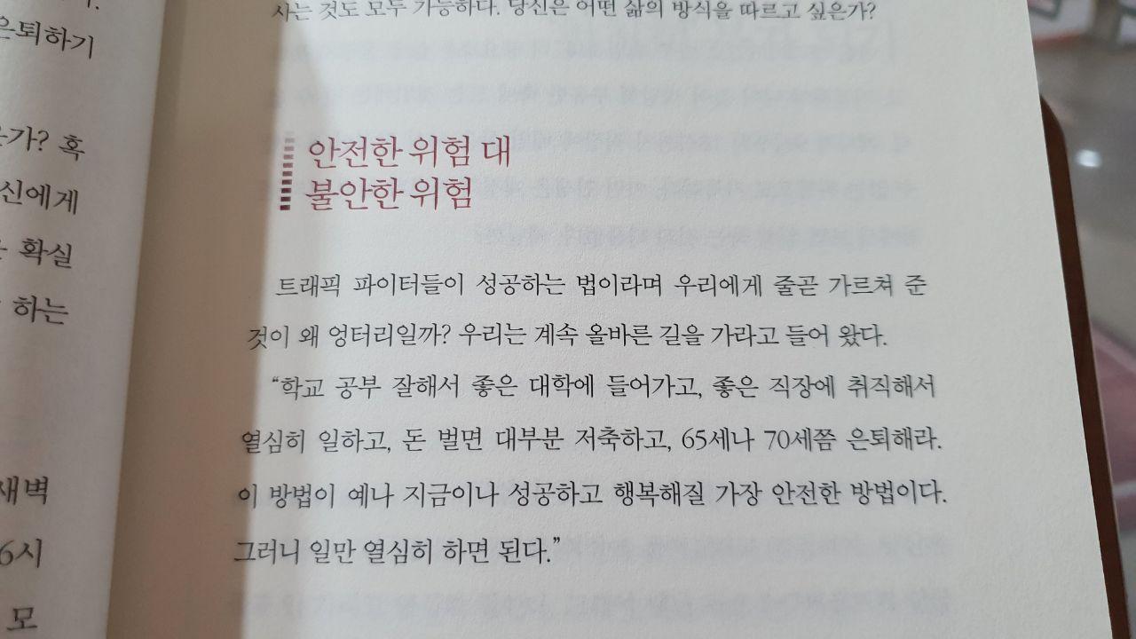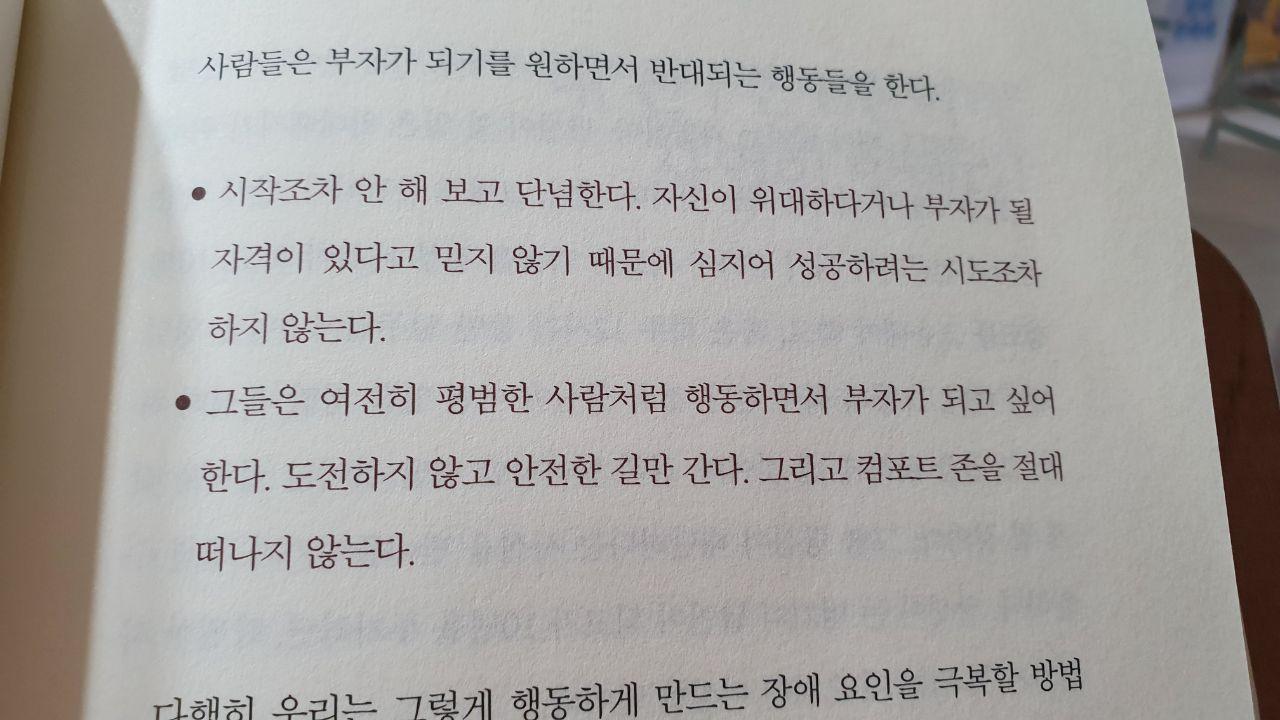 굉장히 현실적인 조언들이 오히려 많이 나와서 실제로 책을 읽으면서 실천에 옮길만한 내용들을 찾기도 했고 실행에 옮기거나 제안하기도 했다. 어떤 것을 이루려고 할 때에는 시간을 들이지 않아도 되는 것이 없다는 사실이 크게 와닿았다. 최근 많은 사람들이 워라밸을 찾고, 무언가 노력하지 않고 즐기는 삶을 추구하는 방향이 많아지다보니 사람들은 뭔가 한방을 노릴 뿐 평상시에 노력하고 싶어하지 않는 경향이 있다. 하지만 진짜 부자가 되고 싶다면 시도하고, 그만 배우고 돈을 벌라고 말한다. 그간 가지고 있는 사람들의 고정관념들에 오히려 반기를 들고 시도하고 시도하라고 말한다. 굉장히 이상적인 이야기를 하는 것 같지만 오히려 일의 본질을 접근하고 생각하게 하는 내용이 많다. 딱 부자만이 아니라 무언가를 성취하려는 사람들에게도 한번쯤 생각해 볼만한 내용들이다. 내가 정말로 무언가를 이루기위해서 노력하고 있는지 말이다.