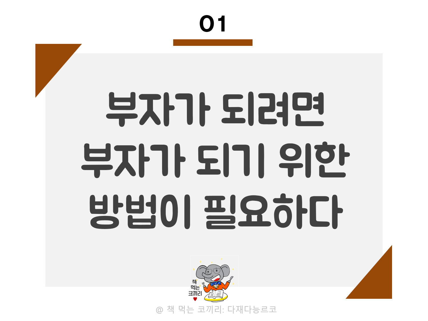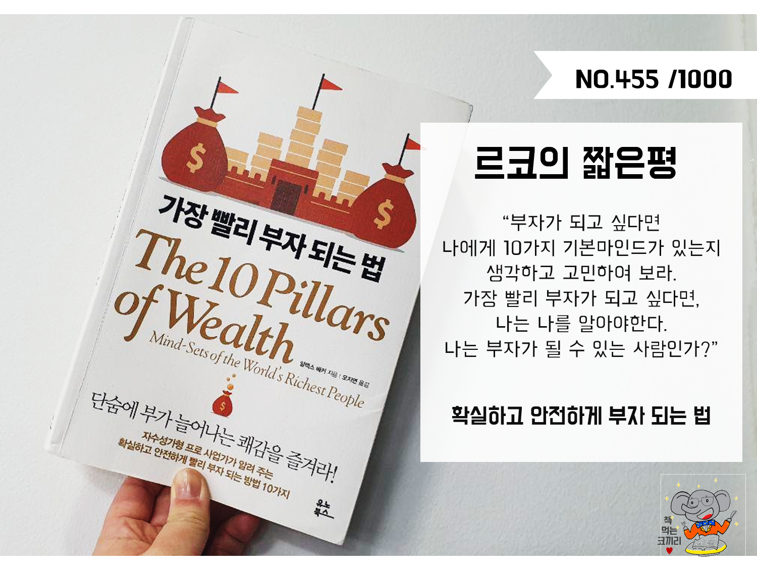 직관적인 제목에 끌려 책을 샀다. 누구나 부자가 되고 싶어한다고 말하지만 언제 부자가 되고 싶은지에 대해서는 생각하지 않는 경우가 많다. 이 책은 그 부분을 생각하기에 좋은 책이 아닌가 싶다. 영어 원문제목을 보면 <The 10 pillars of wealth> 라고 되어있다. 외국인친구에게 물어보니 pillars 는 기둥을 말한다고 했다. 책의 목차가 딱 10가지를 말함을 보여준다. 부자가 되기위해 필요한 10가지말이다. 부자가 되려면 마인드셋부터, 고정관념부터 버려야함과 부자가 되기를 바라면서 이를 위한 시간은 전혀 쓰지 않는 행동을 버려야함을 말한다. 그리고 읽어가면서 생각하게 한다. 나는 어떻게 하면 부자가 되는 시스템을 만들 수 있을까와 내가 진짜 부자가 되기를 간절하게 원하는가에 대해서도 말이다. 원한다면 움직일텐데 나는 왜 더 하지 않는가에 대해서도 생각했다. 남들과 다르게 살고 싶다면, 천천히가 아니라 단숨에 부자가 되고 싶은 사람이라면 이 책의 내용이 조금 더 동기부여가 되지 않을까 싶다.