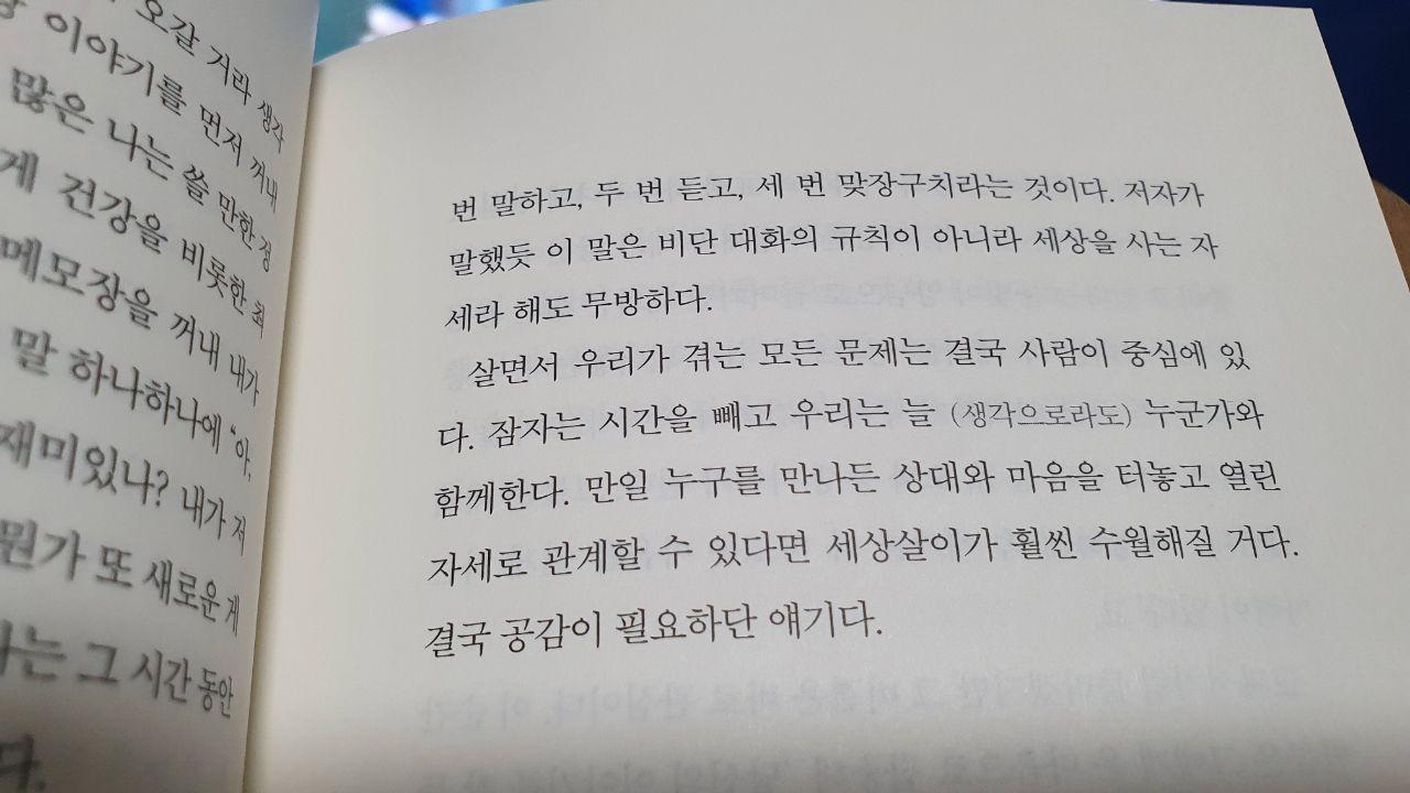 나는 하루종일 쓰는 단어 중 어떤 단어를 많이 쓸까 생각해보는 계기가 되었다. 그리고 과거와 현재 대인관계를 돌아보게 되었다. '나는 그럴 의도가 아니였는데...'라고 느꼈던 그 순간들이 문득 떠오르면서 다시 반성하고 나아가는 계기를 만들고자 마음먹게 되는 책이였다. 먼저 마음먹고 변화하여 바뀐 삶을 담담히 하나하나 만들어가는 가운데 있었던 이야기를 선배가 후배에게 해주듯 따뜻하게 말해주는 그런 책이였다.