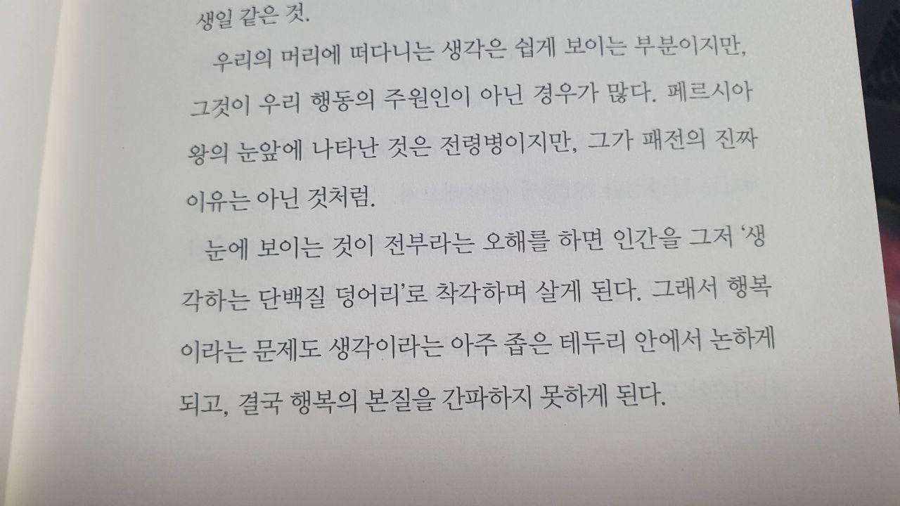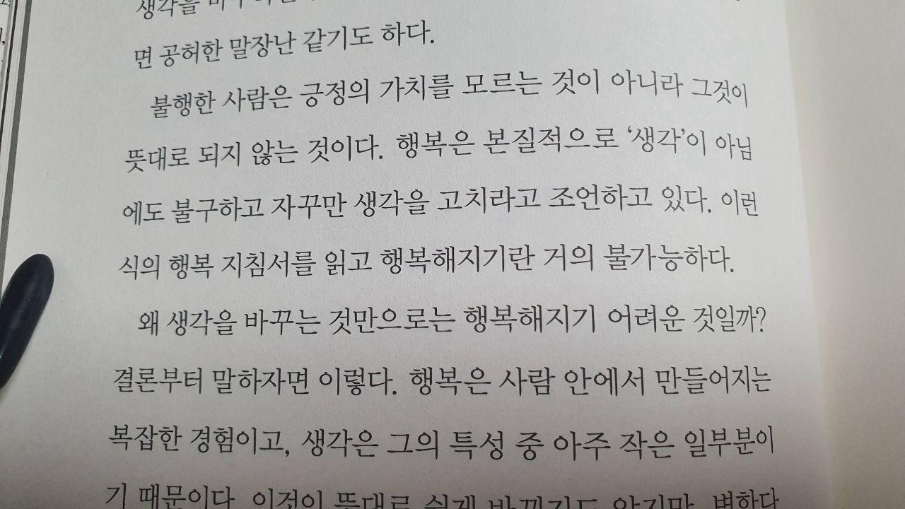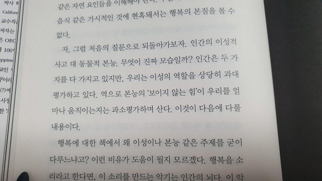행복하기위해서 무언가를 해야한다고 생각해 본적은 많아도 행복을 이해하기위해서 무언가를 해야한다는 생각을 해본 적이 없다는 사실이 참 새삼스러웠다. 아직도 스스로 인지하지 못한 감정과 생각 등 내 안에 무언가를 더 깊이 봐야겠다고 생각이 들었다. 세세한 데이터와 사례를 보면서 생각을 던져주는 질문으로 진행되는 책을 보면서 - '왜 이렇게 생각을 안해봤을까?'라는 질문이 저절로 떠올랐다. 특히나 의식적 사고의 중요성이 과대평가되었다라는 문장에선, 감탄이 나오기도 했다. 감각적으로 느낀 판단에 생각을 씌워서 이해하는 사람의 뇌에 대한 생각은 궁금증으로 커졌다. 그러면서도 나 자신을 우리가 모른다는 부분에서는 크게 공감했다.