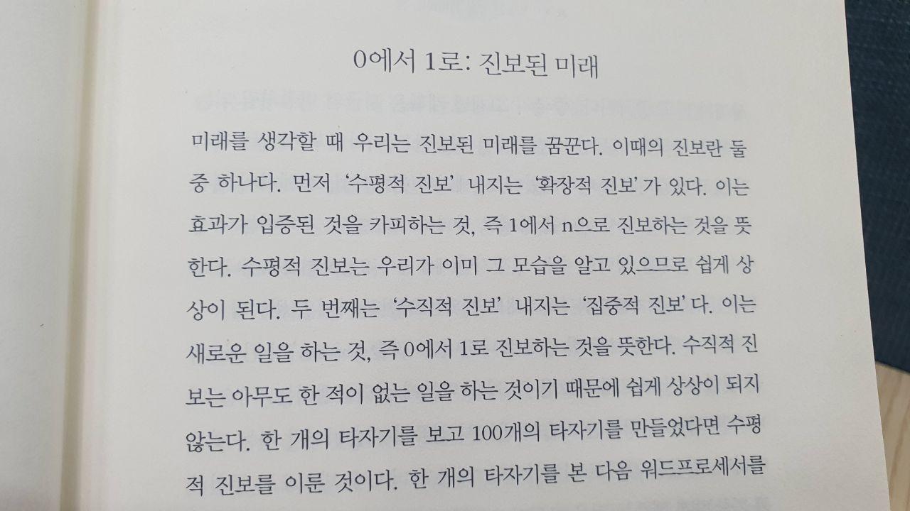 결국 한순간 나타나는 기업이나 인생이 아니라, Last mover가 되어서 1등이 되라고 말한다. 무엇을 하든지 잘하기만 하라고 하는게 아니라, 한눈팔지 말고 오로지 잘하는 것에 집중해야한다고 가르쳐준다. 잘하는 것에 집중하기 위해서 그 일이 미래에 가치있는 일이 될 것인지 치열하게 고민해보라고 말한다. 창조적 독점을 만들기 위해서 '관습'이 아닌 '숨겨진 비밀'을 찾으라고 말한다. 어려운 일은 성취할 수 있으나 가려져있어 많은 사람이 모를 뿐이기 때문이다. 지금 우리에게 쉬워진 것들이 이전에는 전혀 쉽지 않았다. 피타고라스의 정의를 배우려면 피타고라스 근처에 있어야했고 그와 수학이야기를 나눌 수 있어야했던게 그 당시니까말이다. 하지만 이제는 전세계 모든 수학시간에 그의 정의가 나온다. 이처럼 숨겨져 있어서 우리가 아직 잘 모르는 비밀을 찾아 그 가치를 창조하라고 말한다. 가진 것을 발전시켜야한다는 '점진주의', 위험을 감내하지 않고 싶은 '위험 회피', 편안하고 싶은 '무사 안일주의', 글로벌화로 인해 전세계가 동질적적이고 경쟁이 치열한 하나의 시장으로 인식된 '평평화' 이 같은 조건들이 우리가 숨겨진 비밀을 찾지 못하게 만드는 작용이라고 말한다. 어쩌면 0에서 1은 잘못된 관행을 깨는 또 하나의 모험이 아닐까라고 느꼈다.