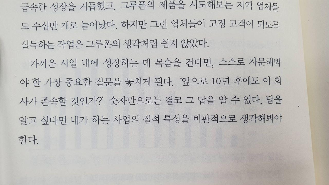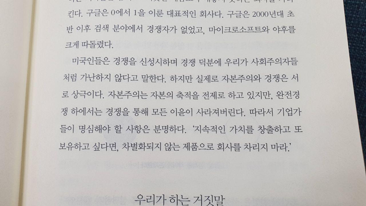나의 삶이 어떤 위치인가를 떠올린다. 수많은 경쟁속에서 치이고 있는지, 독점으로 승승장구하고 있는지 말이다. 창조적 독점이란 새로운 제품을 만들어서 모든 사람에게 혜택을 주는 동시에 그 제품을 만든 사람은 지속가능한 이윤을 얻는 것이다. 지속가능한 이윤을 떠올리니, 나는 과연 나의 삶 가운데서 독점하여 낼 수 있는게 있을까라고 생각했다. 모두 어릴 때는 아주 훌륭한 미래를 가지고 있었으나 현재는 그저 미래를 전전긍긍하며 산다고 한다. 하라는 대로 한 사람들의 과거 상태역시 훌륭한 미래가 기다리는 것이였으니 말이다. 단순히 뭔가 유니크한 것만을 만들어내라는 뜻으로 독점이 아니라 지속가능성을 말한다는 데서 지극히 현실주의적이다라는 느낌을 받았다. 기존 기술의 10배는 차이나는 기술력이 있거나 네트워크를 지니고 있거나 규모의 경제를 실행할 수 있거나 실질이 있는 브랜드전략을 가지고 있는 독점 기업들의 특징들을 보면서 - 어떻게 가치를 실현하면서도 성공할 수 있는지에 대해서 생각해보게 되었다.