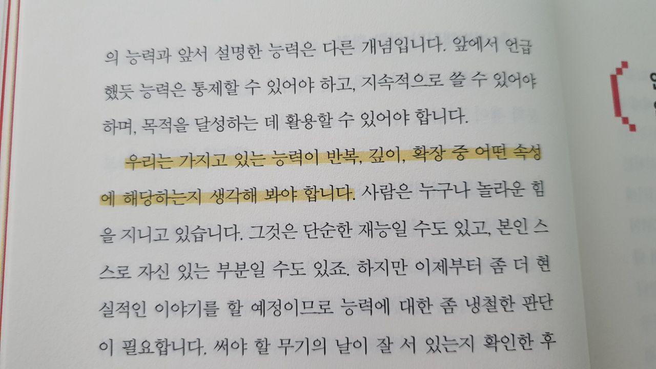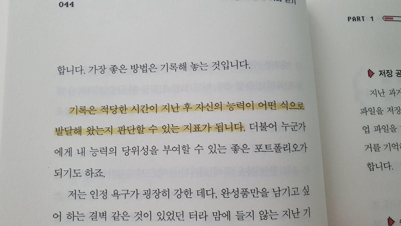개선하는 방법들을 구체적으로 제안하면서도 주관적보다는 객관적으로 비기를 말한다. 팩폭도 잊지않고 조언도 잊지 않는다. 이 책을 쓴 사람이 얼마나 많이 기록하고 이를 이 책에 담아서 글로 만들었을까가 궁금해질 정도다. 읽는 이로 하여금 생각하게 하고, 나아가고 싶게 만들고, 스스로 피드백하게 해주는 책이 좋은 책이라고 현재는 생각한다. 그래서 어떤 책을 읽든 생각과 이를 실천으로 바꾸기위해 노력하는 편인데 - 어떤 실천을 해봐야할지 하나하나 잡아주다보니 더 실질적인 방법들이 떠오르게 되는 책이다. 책의 한파트가 지날때마다 게임게이지처럼 생긴 막대가 점점 차오른다. 마치 이 책을 다 읽고 나면 레벨업이 되지 않을까라는 생각까지 들게 한다.