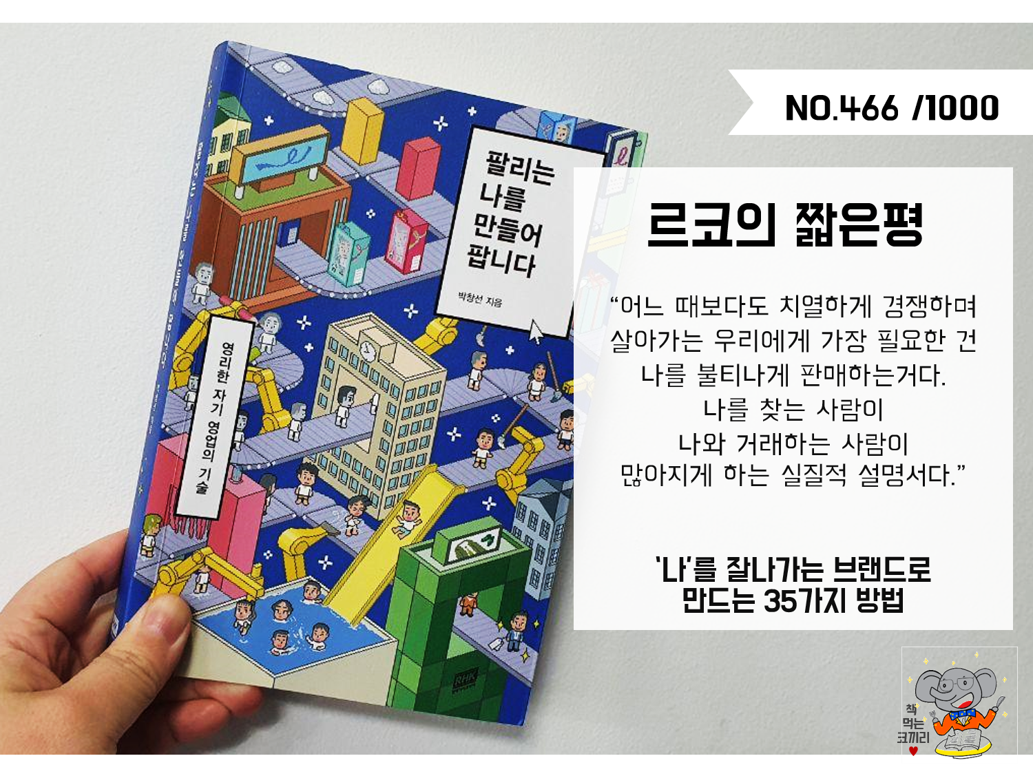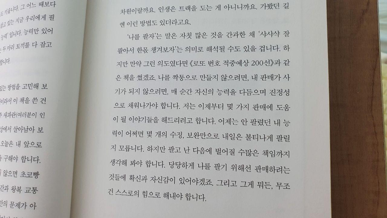 이 책은 자기계발서가 아니다. 부제는 '영리한 자기 영업의 기술'이지만, 로또 같은 방법은 나오지 않는다. 오히려 무인도 생존가이드마냥 회사에서 살아남는 방법을 친절한 메뉴얼로 제공하는 느낌을 받는다. 어떤 설명을 할 때 작가는 '용어'부터 정의한다. 자신이 전하고 싶은 문장이 오해없이 이해로 다가갈 수 있도록 말이다. 소통이 되지 않는 이유는 다양하지만, 각자가 생각하는 그 단어의 느낌이나 정의가 달라서 이루어지기도 한다. 그렇기에 이 책은 친절하다. 전문보험인으로 영업인이자 강사, 코칭으로 N잡러로 살아가는 나에게는 꽤나 많은 부분에서 그동안의 내가 하는 업무에서 내가 막연하게 혹은 어렴풋 느꼈던 부분들을 선명하게 보일 수 있도록 하는 안경같은 느낌을 받았다. 책을 읽으면서 메모를 하는 내가 '초록색 펜'으로 나의 생각을 적는데, 이 책은 어떤 문장을 마주하면 생각과 아이디어를 많이 적을 수 있던 책 중 하나다. 3월의 베스트 도서로 뽑아도 될 것 같다.