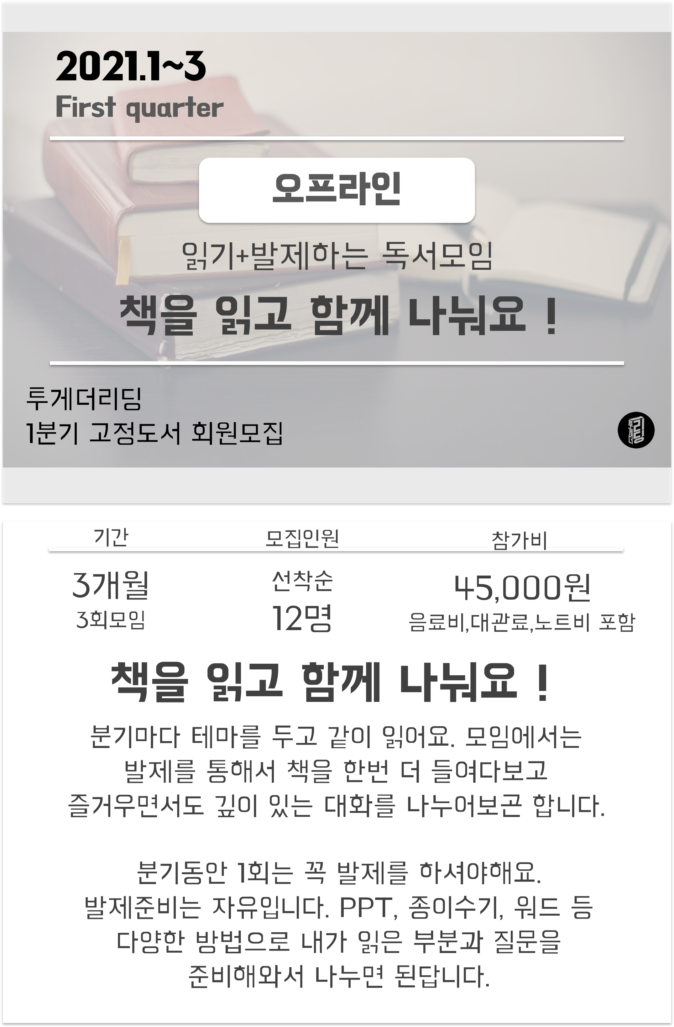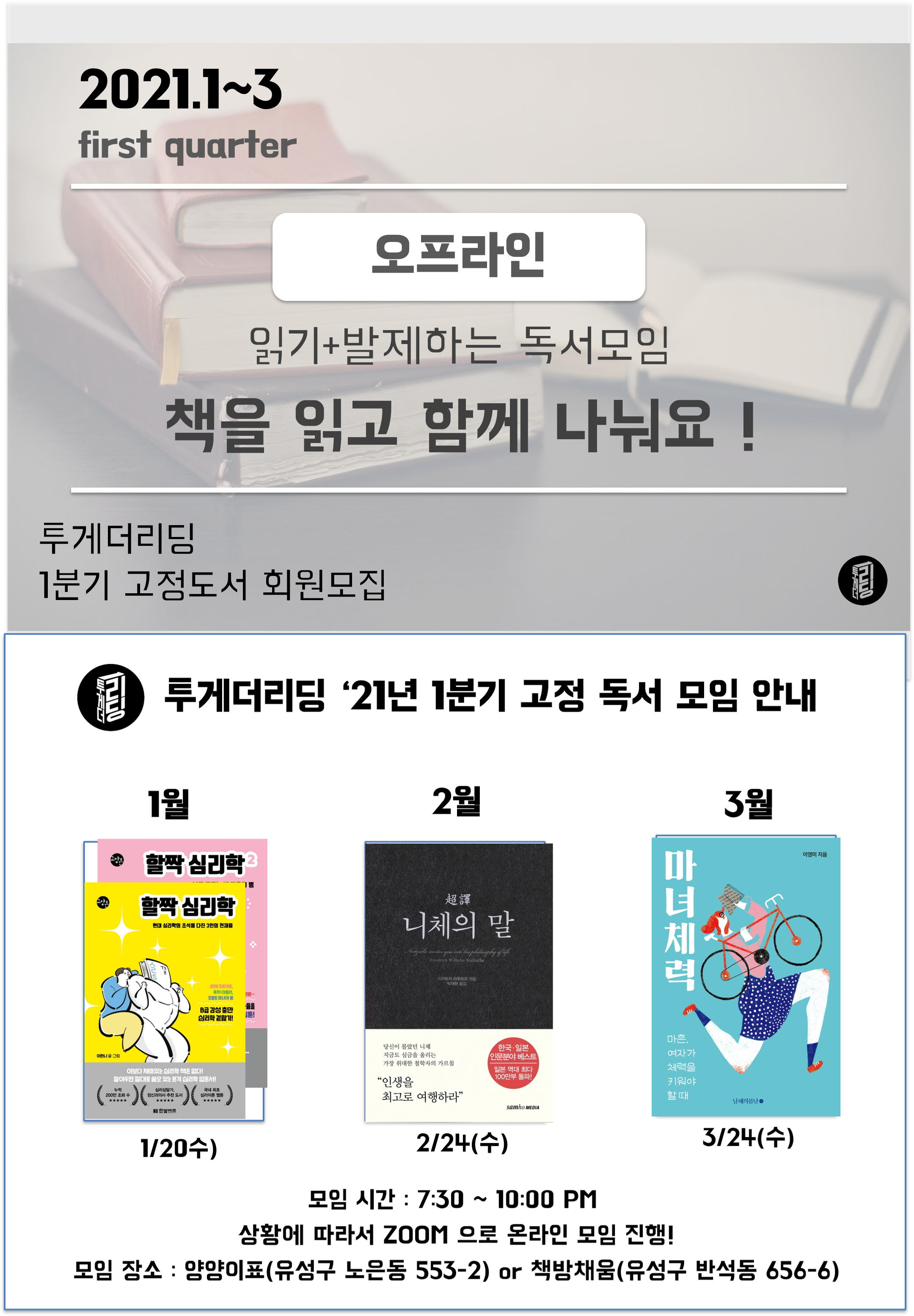 | [모집] 2022년 3분기, 투게더리딩 픽리딩모임 모집합니다 (0) | 2022.07.13 |