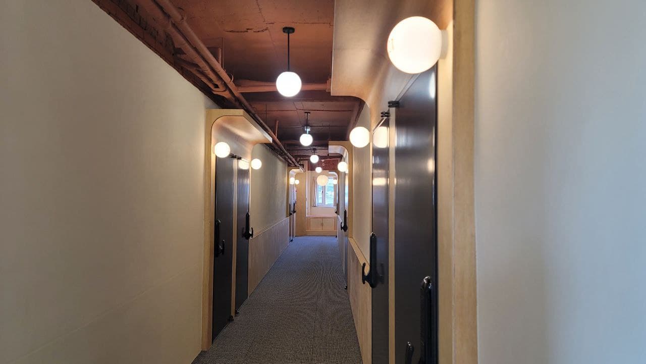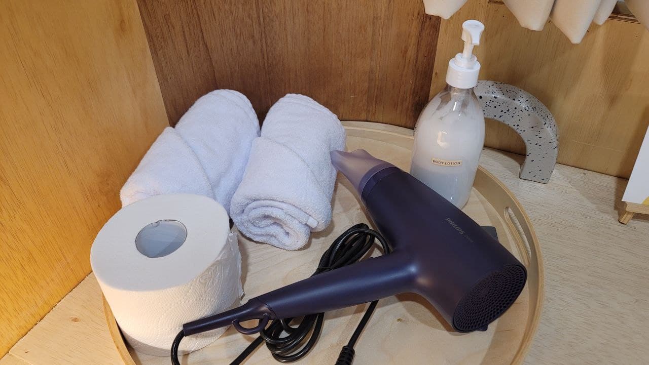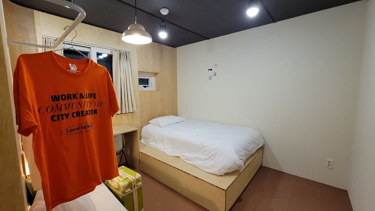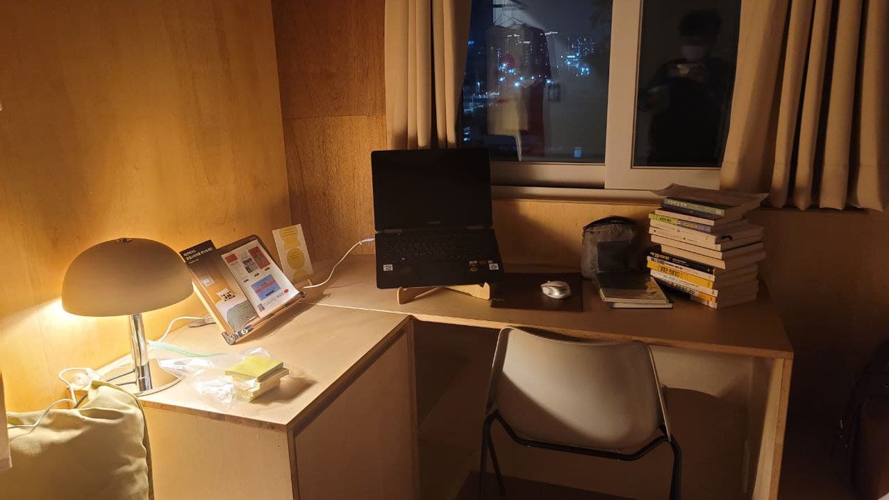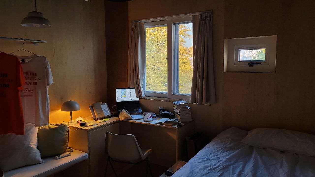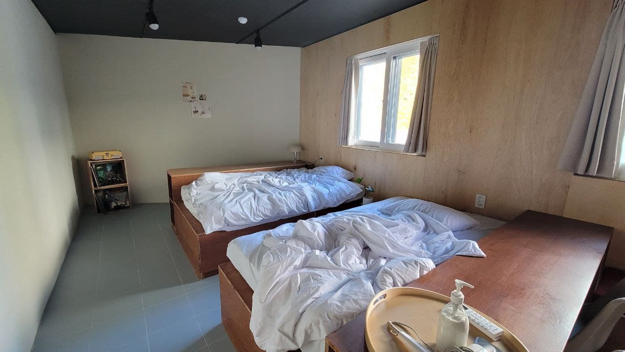 숙소가 정말 특이했어요. 뭔가 생각의 틀이 깨어지는 느낌이랄까요? 주거공간에 잘 쓰이지 않는 소재들이 가능한 방이라 더 특이하다고 느꼈네요. 미니냉장고도 있고, 샴푸, 린스, 바디워시가 준비되어있어서 장기숙박시에도 좋겠더라구요. 다만 폼클렌저나 칫솔치약은 본인이 챙겨야하니 참고하세요! 방은 1인실로 구성되어있고, 콘센트도 적절히 있어서 좋았어요. 그리고 바닥이 온돌이 들어오는 곳이여서 참 따뜻했답니다.