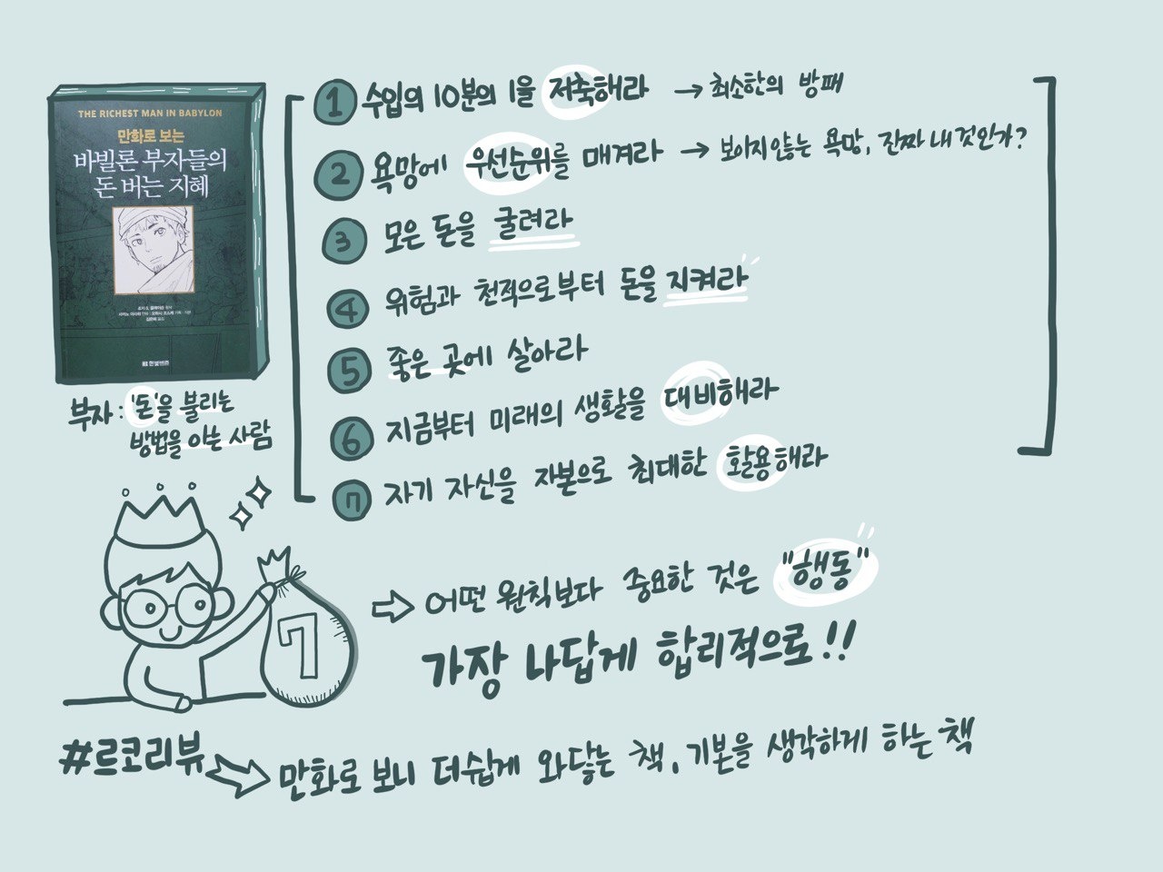 기본적인 내용을 새겨보기에 좋은 책. 글로 된 책이어려웠다면 만화로 된 이 책이라면 더 쉽게 읽히지 않을까 싶다. 물론 원작의 내용을 함축해둔 부분이니 내용이 마음에 든다면, 원작도 읽어볼 걸 권한다. 나오는 7가지 방법으로 100% 부자가 된다라는 건 아닐지도 모른다. 하나 이 모든 #재테크 의 방법들을 나에게 맞게 쓴다면 충분히 도움이 될 수 있는 내용들이 있으니 - 추천해주고 싶다.