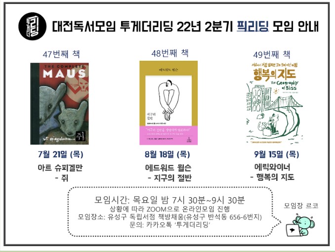 투게더리딩 '22년 3분기(7월~9월) 고정도서모임 참가 신청 받습니다. 모임 시간 : 7:30 ~ 9:30PM 모임 장소 : 책방채움(유성구 반석동 656-6) / 상황에 따라 ZOOM 네이버 지도 링크 https://bit.ly/3eE1zjW 모집 인