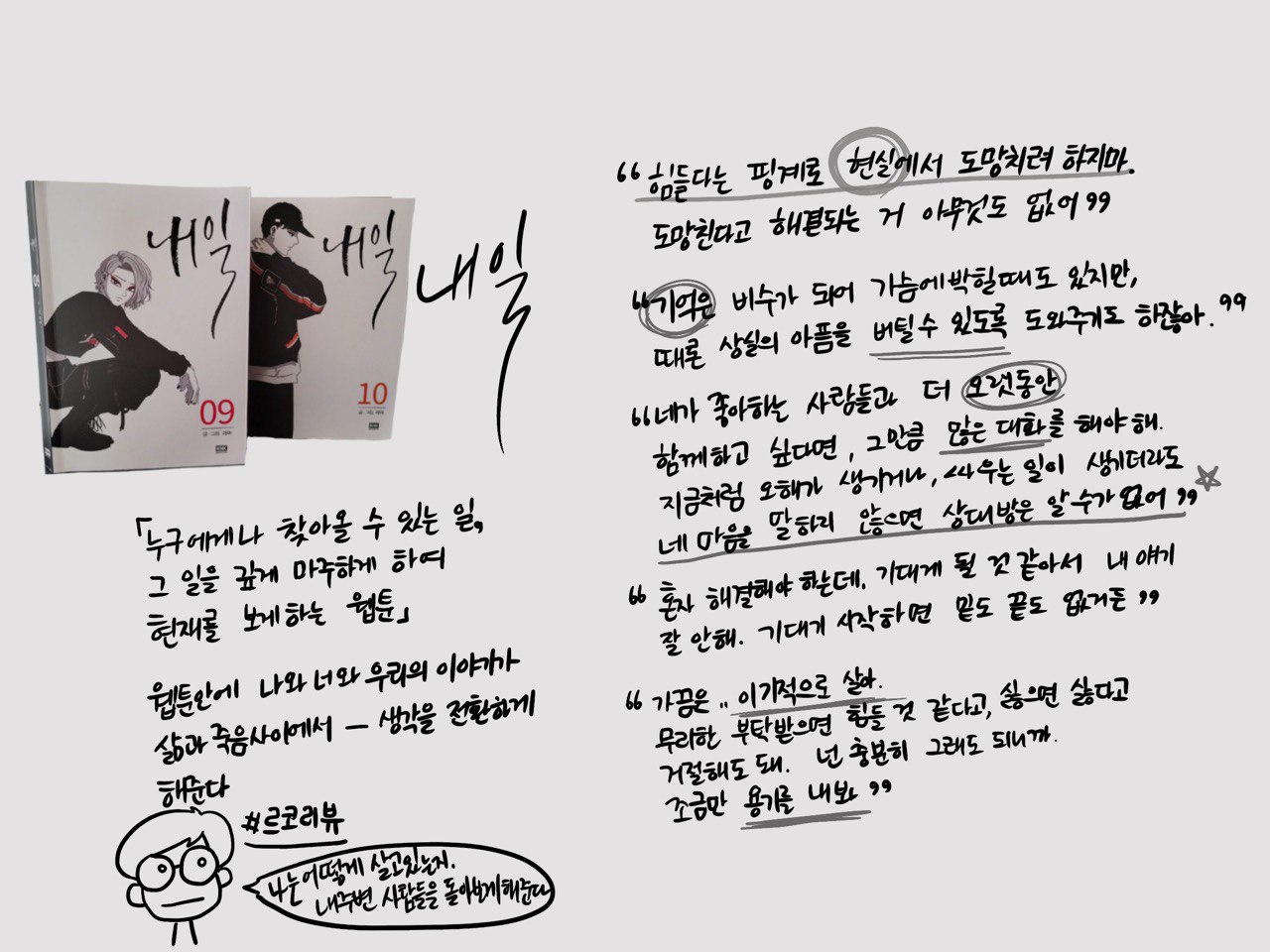 죽음의 길로 안내하는 저승사자들이 삶에 마지막에 있는 사람들의 죽음을 막는다면 어떨까? '내일'은 이 물음이 스토리로 펼쳐지는 웹툰이다. 다양한 상황에서 죽고싶어하거나 그럴 마음이 들 일이 생긴 사람들 주변에서 알아줬으면 하는 마음을 알아주고, 가장 필요한 한 마디를 해주고, 필요한 순간 곁에 있어줌으로 그 사람들의 마음을 다시 되돌려준다.