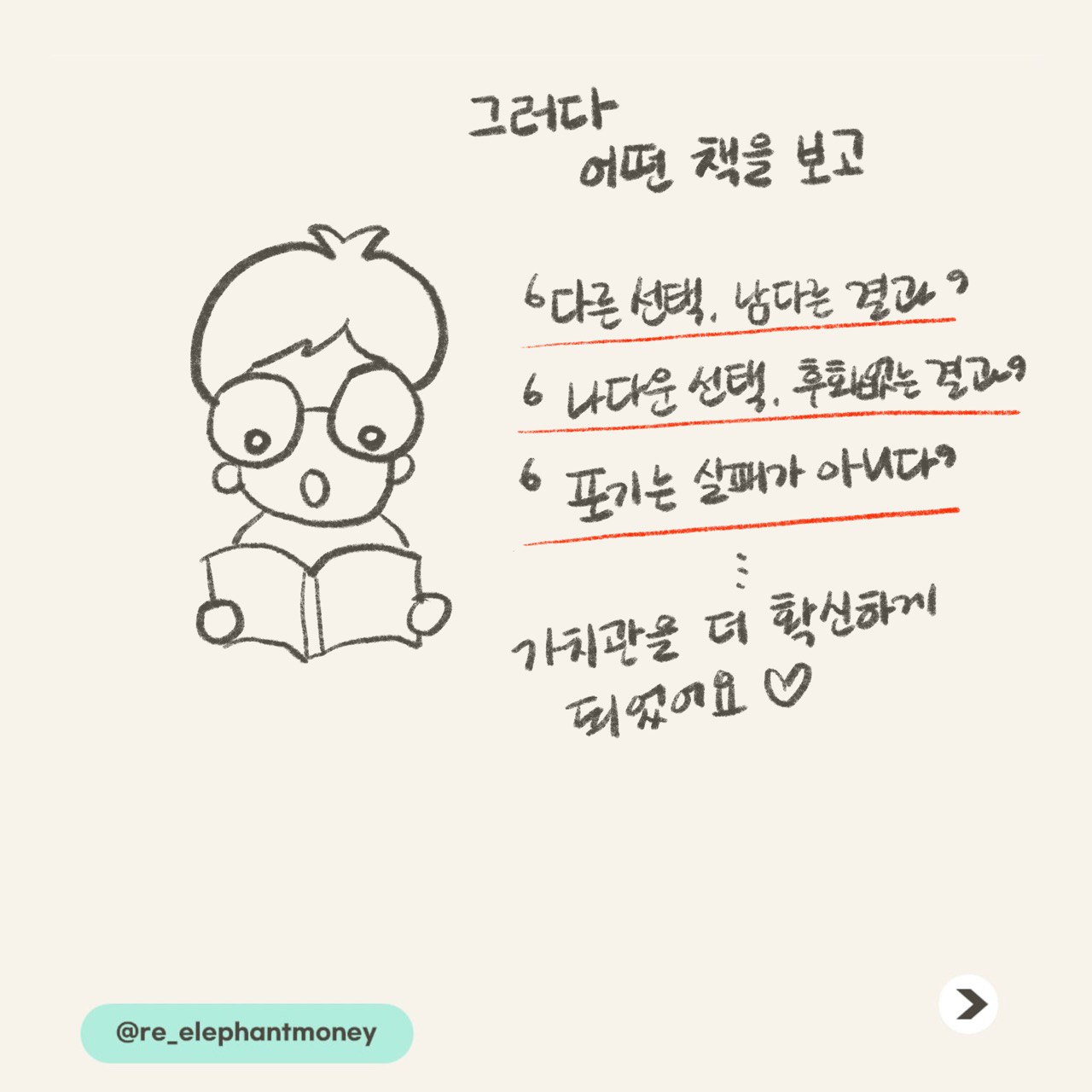 05. 마음가는대로, 나답게 가도 된다는 생각이 드는데 10년이 걸린 셈이죠. 그런데 최근 읽은 이미소 대표님의 책을 보면서 제가 10년에 걸쳐서 믿어지게 된 일에 더 확신이 들었어요. 다른 선택으로 남다른 결과를 만들고, 나다운 선택으로 후회없는 결과를 만들고, 포기가 실패가 아니라는 등 가치관을 더 확신할 수 있게 되더라구요.