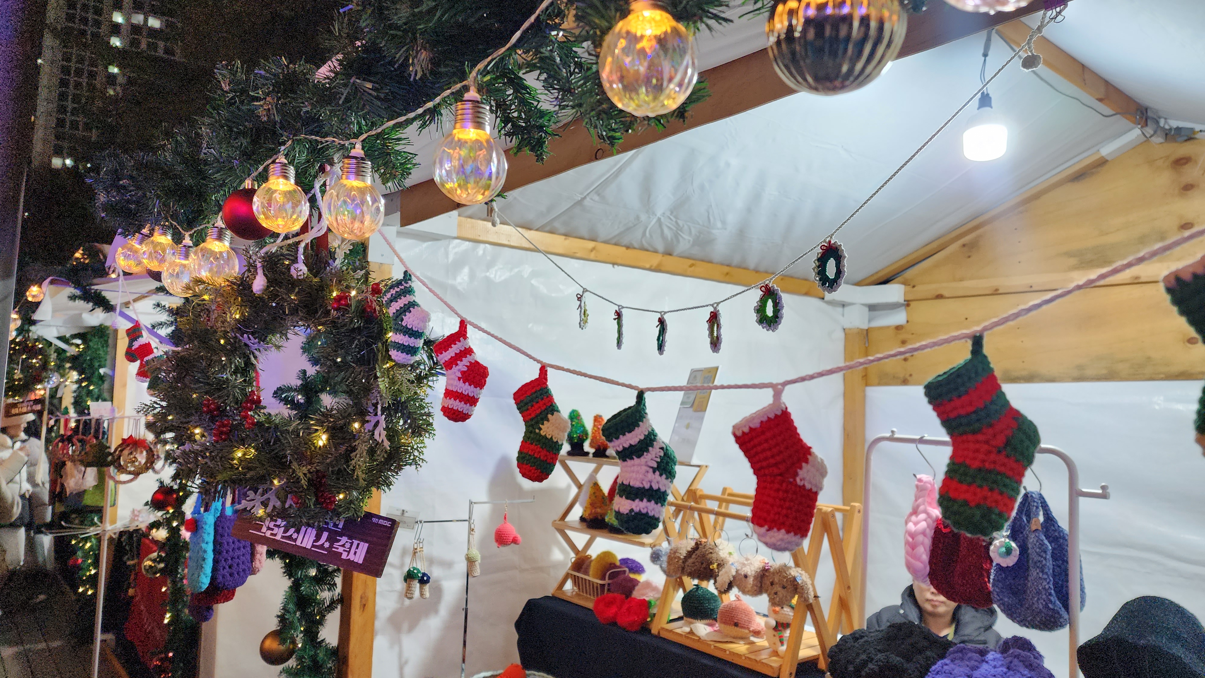 보는 것만으로도 크리스마스구나가 느껴지는 크리스마스 마켓은 정말 다양한 물품들을 만나볼 수 있었는데요. 유성구 캐릭터 유성이 굿즈부터, 손뜨개, 바느질, 조명, 와인 등 크리스마스에 즐길 거리를 미리 준비할 수 있는 장이 열렸답니다. 정말 많은 분들이 나와서 물건들을 보고 가족, 친구, 연인과 함께 축제를 즐기는 모습들을 볼 수 있었는데요.
