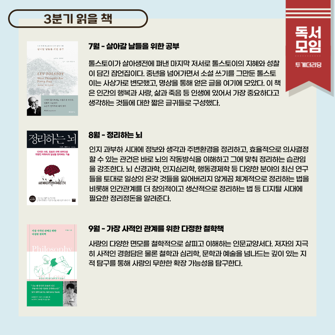 투게더리딩 '25년 3분기(7월~9월) 고정도서모임 참가 신청 받습니다. 7월 22일 (화) 8월 26일 (화) 9월 23일 (화) 모임 시간 : 7:30 ~ 9:30PM 모임 장소 : 책방채움(유성구 반석동 656-6) / 상황에 따라 ZOOM 네이