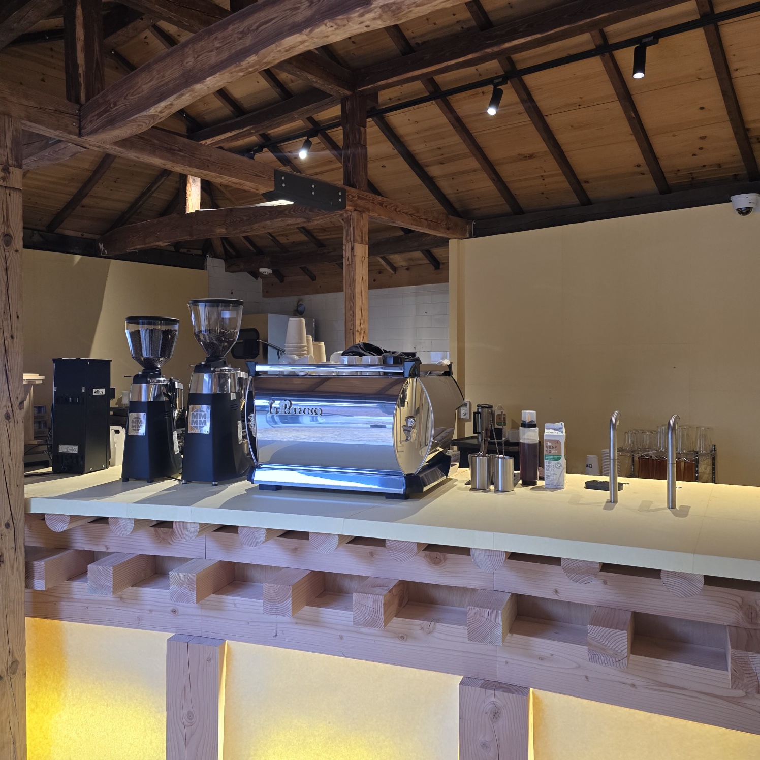 내부 느낌이 일본식 + 한옥이 가미된 느낌이예요. 뭔가 공간자체가 매력인 곳이예요. 이전에 지어진 구조를 고스란히 살렸다는 느낌이 좋았고 실내 조명이 따뜻한 느낌이예요. 실제로 통창 카페인데 뭔가 겨울인데도 따뜻하게 느껴졌어요. 밖에서 보아도 따뜻한 느낌의 조명이라는 게 느껴집니다. 다만 테이블이 카운터 앞쪽 빼고는 작은 편이라서 뭔가 작업이나 이런 것 보다는 대화하러 가신다면 추천입니다.