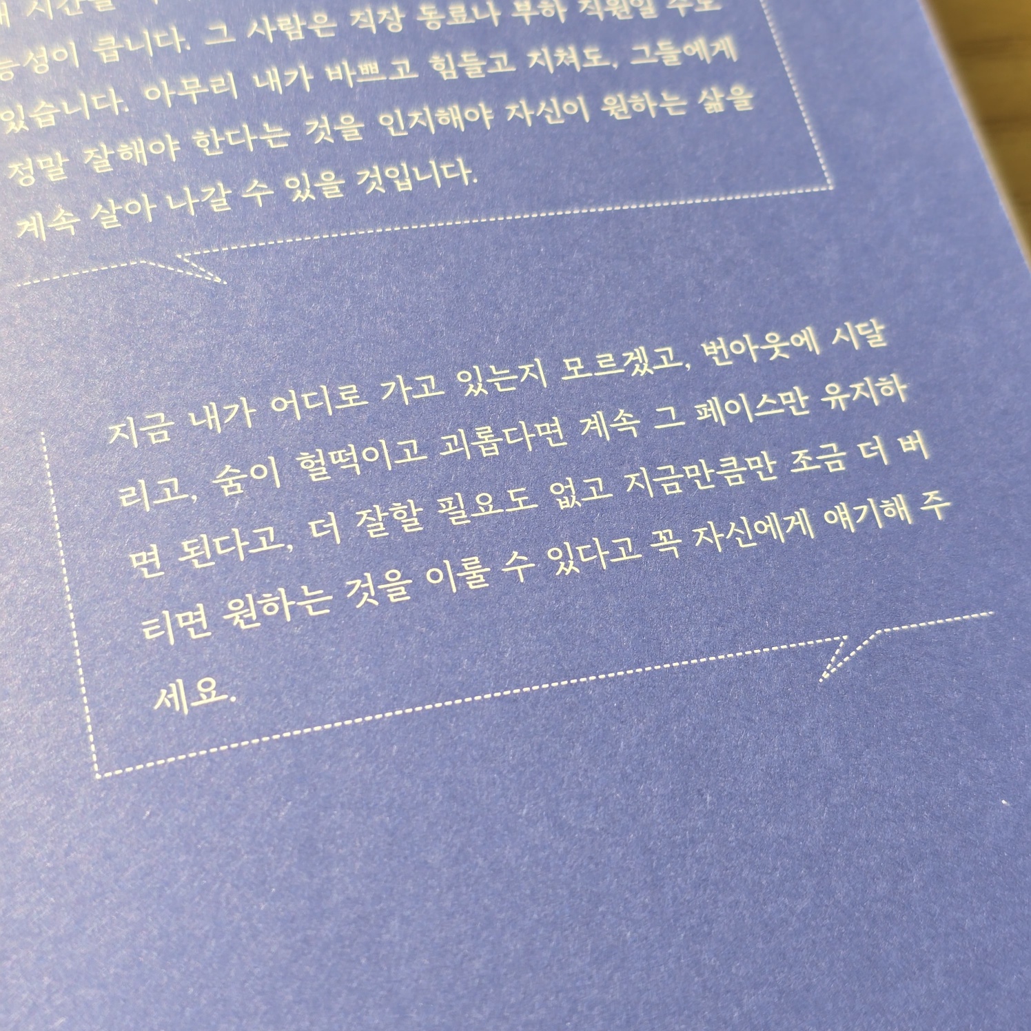 이 책이 설득력있고 잘 읽히는 이유는 성공담만 나열하지 않기 때문입니다. 인생에서 어떤 사람들로 인해 잘 지낼 수 있었는지, 반대로 누군가가 보기에는 완벽해보이고 좋아보이는 삶에서도 언제 크게 무너졌었는지를 이야기해주며 여러번의 경험을 통해 나를 살리고 다시 일어나게 하는 루틴을 만들어야한다는 점도 이야기해줍니다. 시도때도 없이 많은 생각들이 쏟아지지만 그럼에도 불구하고 오늘은 걸어가려고 한다는 이야기가 마음을 울리기도 합니다.